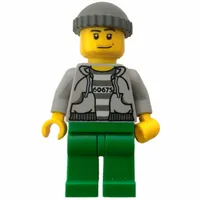 Criminal, Open Light Bluish Gray Hoodie over Prison Shirt with #60675, Dark Bluish Gray Hat, Stubble