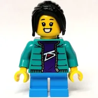 Kid - Dark Turquoise Torso, Medium Lavender Legs, Bright Light Orange Helmet, Black Hair